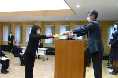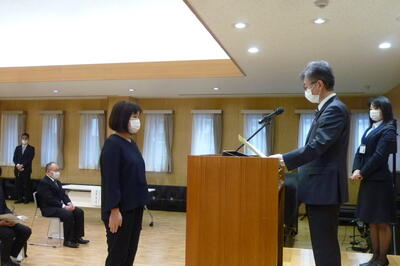 本日の表彰式では、代表で研修主任の由美子先生に教育長より表彰状が授与されました。