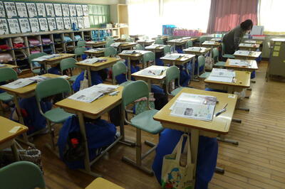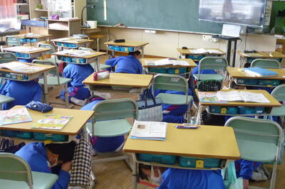 5、6年生は、カーテンを閉めて机の下にもぐって身を守りました。