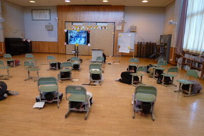 4年生は、多目的ホールに移動して、壁に寄り添って身を守りました。