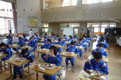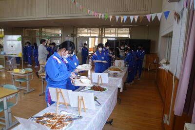 今日は6年生の卒業『お楽しみ給食』です。多目的ホールには、栄養士の鈴木先生中心に保健の先生や支援員の先生方たちが飾りつけや配膳のお手伝いをしてくれました。調理員さんたちがおいしい料理を作ってくれました。