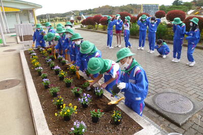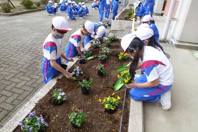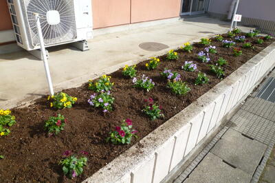 全校で、花の苗植え作業を行い、各学年ごとに担当している花壇にビオラを植えました。