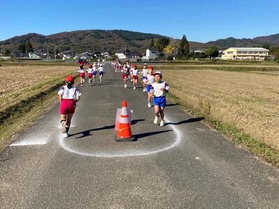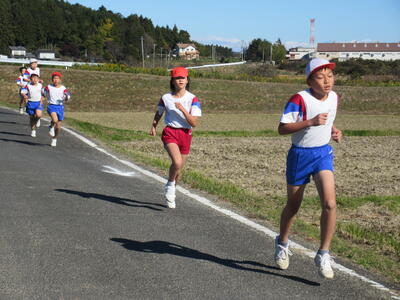 2時間目と3時間目の授業の間の業間の時間に、全校生と幼稚園生、職員が校庭に出てランニングを行う「大野ランニングにタイム」に取り組んでいます。放送で曲が2曲流れる間、できるだけ歩かないように自分のペースで走っています。