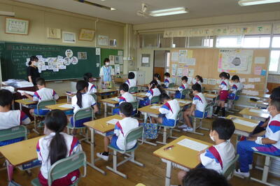 4年生は今日、小児生活習慣病検診で、血液を採りました。そのあと、中村一中の栄養教諭の丹先生の食育教室を行いました。めあては「生活習慣病を予防するにはどうすればよいか」です。