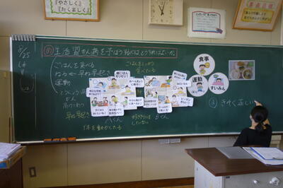 糖尿病や、高血圧にならないためにはどうしたらいいか考えました。そのためには食事、運動、睡眠が必要です。「きそく正しい生活をする」ということでまとまりました。規則正しい生活のために自分がすることを決めて、明日から5日間チェックをします。お家の方も応援してください。2回目の食育授業もあります。そのころには今日の検査の結果も出ていることでしょう。