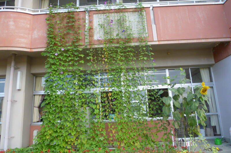 夏休みの間に緑のカーテンができました。まずは、アサガオです。2階まで伸びています。ひまわりよりも高く伸びるんですね。