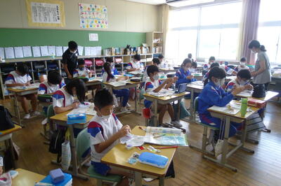 5年生は、家庭科の時間ボタン付けの練習をしました。