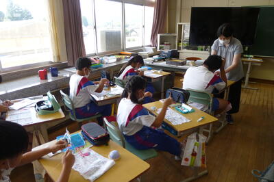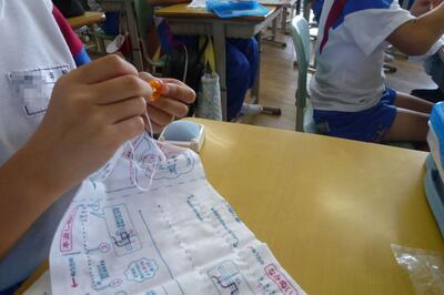 一人ひとり先生に教えてもらい、練習布にボタンを付けました。結構難しかったですが、付けることができました。