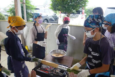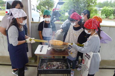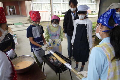 6年生は、今月末に行う宿泊活動の野外炊飯の事前学習として、中央公民館、大野公民館の方々を講師にバームクーヘンづくりをしました。