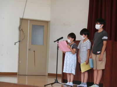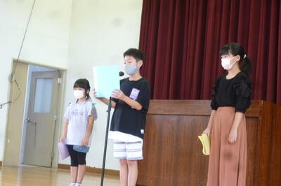 2年生 齋藤侑奈さん、4年生 酒井大和さん、6年生 齋藤結菜さんが 夏休みの思い出と2学期のめあてについて発表しました。