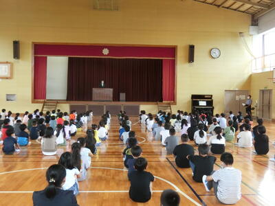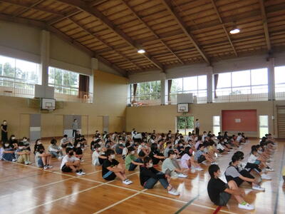全校生で体育館に集まりました。
