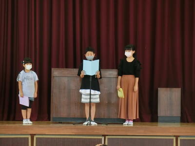 2年生代表の齋藤さん、4年生代表の酒井さん、6年生代表の齋藤さんが、「夏休みの生活と2学期頑張ること」について立派に発表しました。聞く人もしっかり聞いて大きな拍手をおくりました。