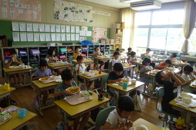 久しぶりの給食です。今日の献立は夏野菜カレーとフルーツ杏仁、牛乳です。カレーには、にんじん、玉ねぎのほか、なす、かぼちゃ、トマトが入っていました。