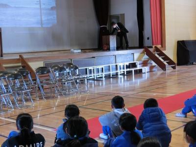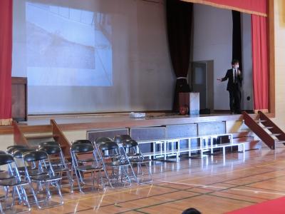 子どもたちは、物音ひとつ立てずにスクリーンの映像を食い入るように見、校長先生の説明をよく聞いていました。
