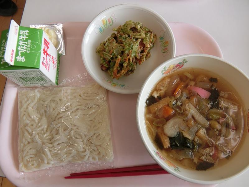 とり南蛮うどん、牛乳、かき揚げ(相馬ののりがたっぷり入っています。)、チーズ