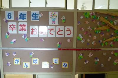 明日は、令和2年度の卒業証書授与式です。1年生から5年生まで、各教室の廊下には、6年生への感謝の気持ちを込めて、お祝いの掲示がされています。