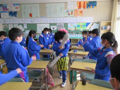 校舎のあちこちから聞こえてきた「鬼は外、福は内」の声。疫病退散の願いも込めた豆まきになりました。