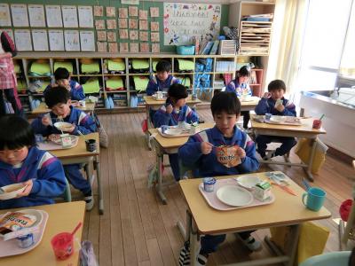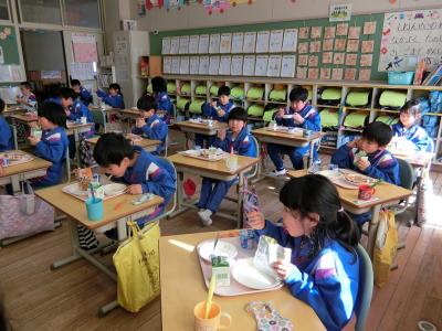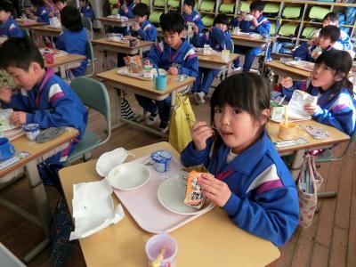 1年生は、珍しい給食を面白そうに食べていました。袋から直接食べるのは初めてです。