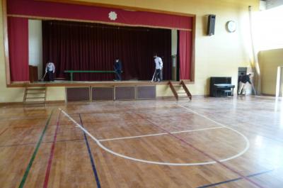 体育館は、天井から誇りがたくさん落ち、雪のようにつもりました。電機は今もつきません