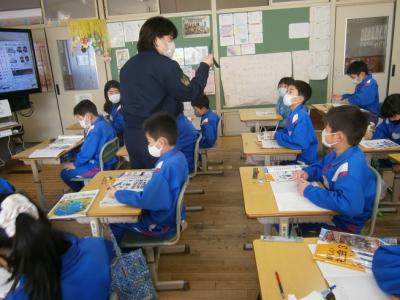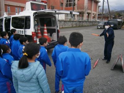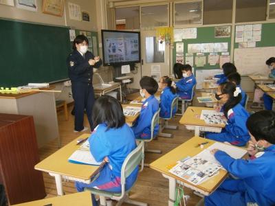 3年生は社会科でいろいろなお仕事について勉強します。今日は警察官のお仕事について相馬警察署の方に来ていただいて、教えていただきました。