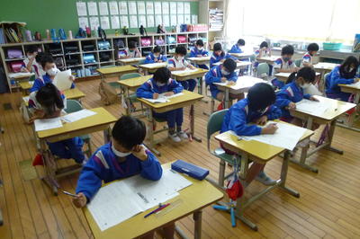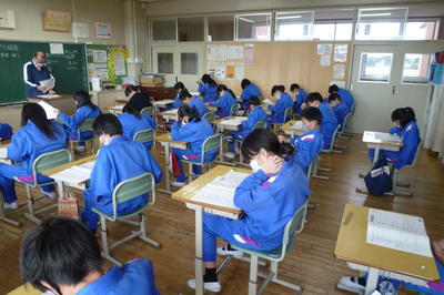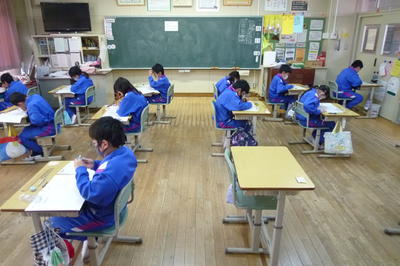 本日は、相馬市学力テストです。現在全校児童が2教科目のテスト問題に取り組んでいるところです。