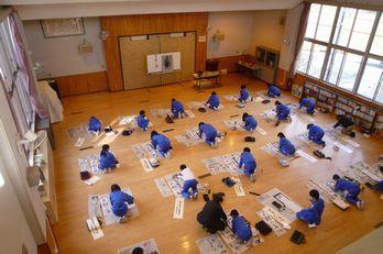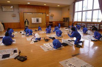 6年生は書写の時間に、書初めの練習を行いました。専科の塩沼先生から書くポイントを教えてもらい、一筆一筆丁寧に書きました。書初め用の用紙が大きいので多目的ホールで行いました。