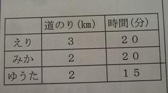 かかった時間と進んだ道のりを比べて「3人のうちで一番速いのは誰だろう?」えりさんとみかさんは時間が同じ、みかさんとゆうたさんは道のりが同じなので比べられるけど、「えりさんとゆうたさんではどちらが速いんだろう?」前に勉強した「単位量当たりの大きさ」を参考に、まずは自力解決をしました。