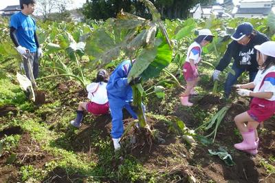 1年生は、6月3日(水)に、大野村農園様の農場に植えた、相馬の幻の伝統野菜である里芋の『相馬土垂(そうま どだれ)」の収穫を行いました。