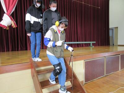 道具を身に付けることで、お年寄りの視界や体の動きを体験できます。