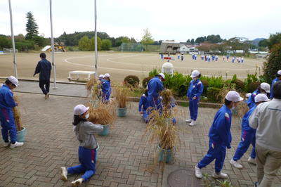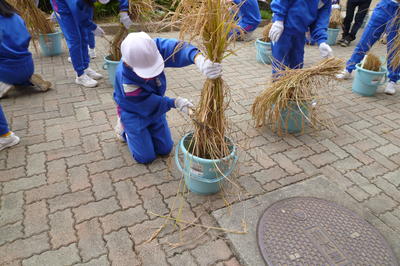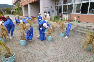5年生は、JAさんのご指導で栽培してきた、バケツ稲の稲刈りを行いました