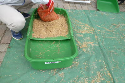 この機械では風を送って、モミとわらくずを分けます。1回では分けられないので、何度も行うそうです。