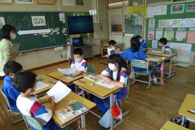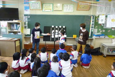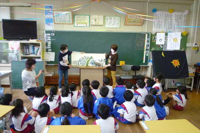 地域にお住いの西村さんと布施さんによる絵本の読み聞かせ、今回は1年生でした。