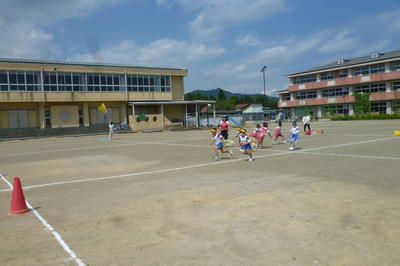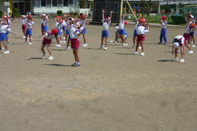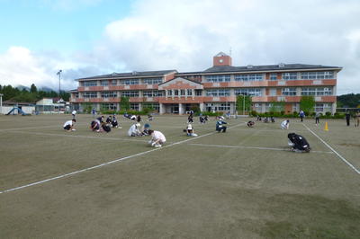 1,2年生は準備体操の後、まずは個人走の並び方です。