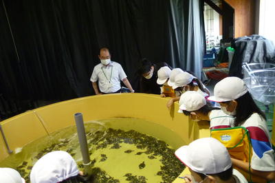 次におととしできた福島県水産資源研究所を見学しました。ここでは、ヒラメやホシガレイ、アユ、アワビの稚魚を育てています。