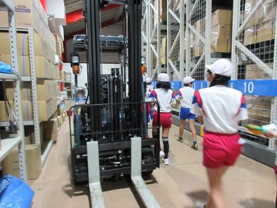 広いフロアには、たくさんの棚があって、非常用食料、毛布など、いろいろ積まれていました。