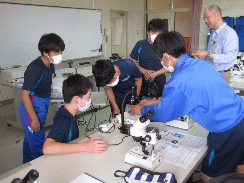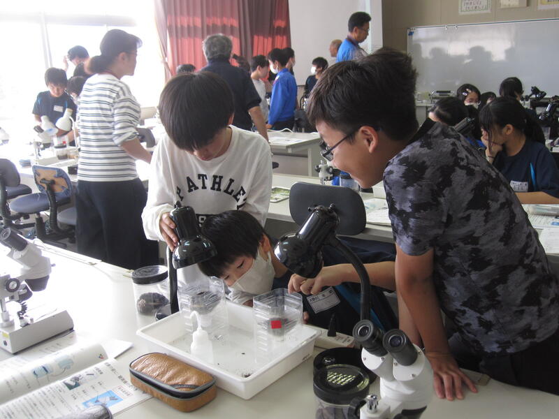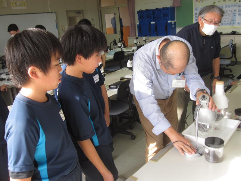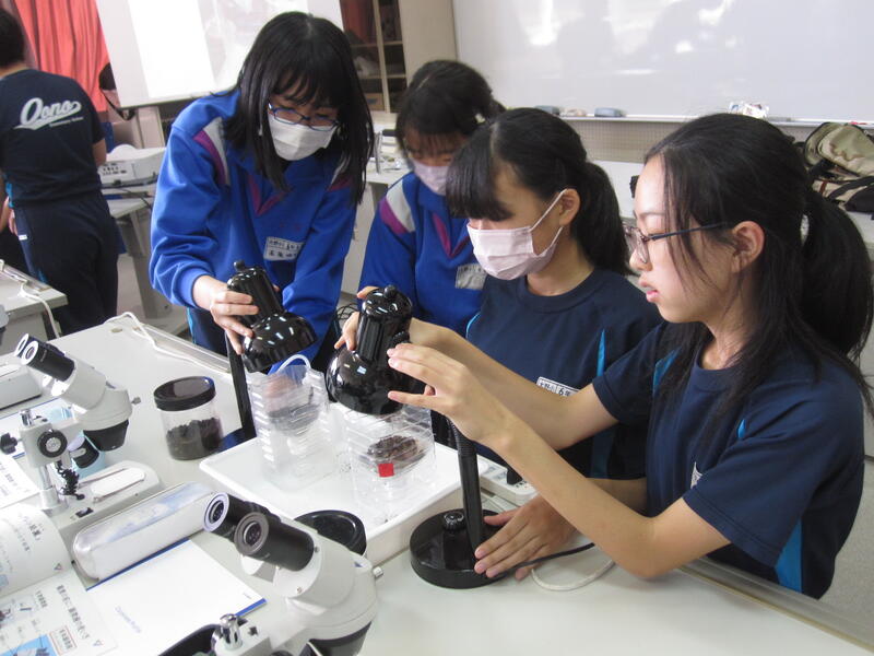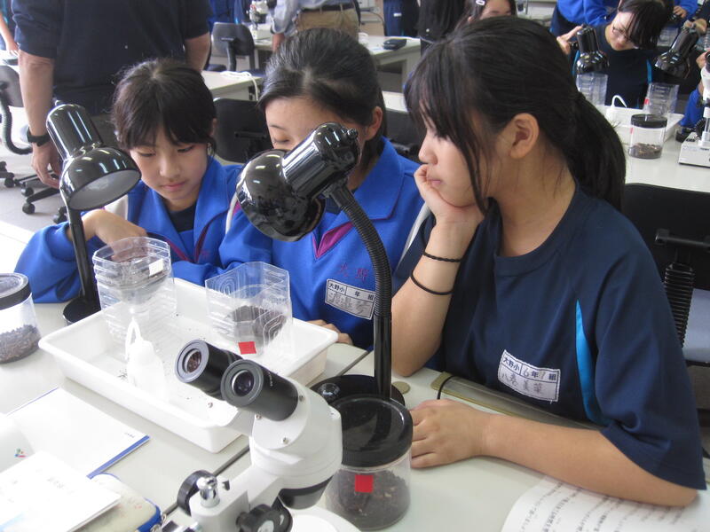 実験ではツルグレン装置を使って、森の土から出てきた土壌生物を顕微鏡で観察しました。