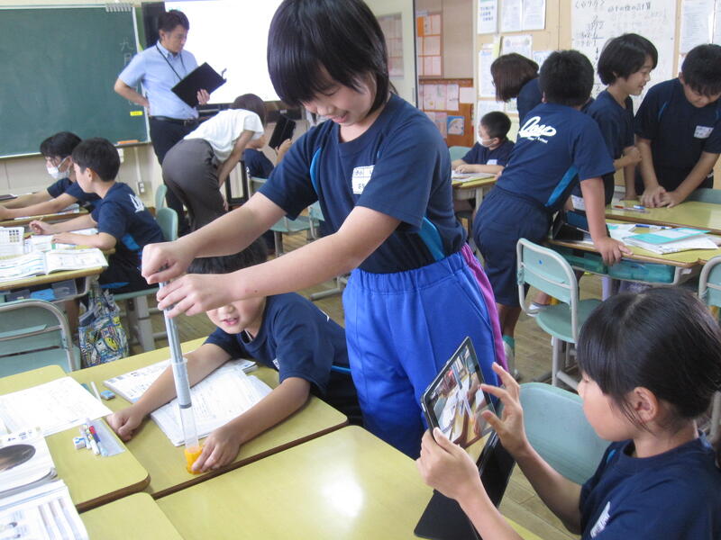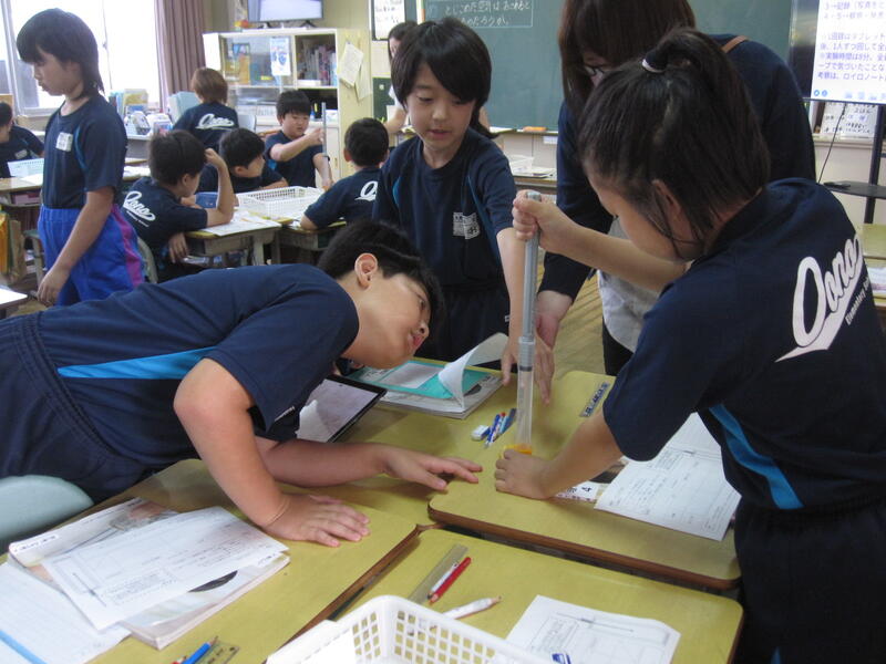 4年生の子どもたちは、空気を押したときの押し返すような手ごたえや体積は小さくなるもののなくなる(最後まで押し切る)のではないということを実験を通して体で感じながら学ぶことができました。