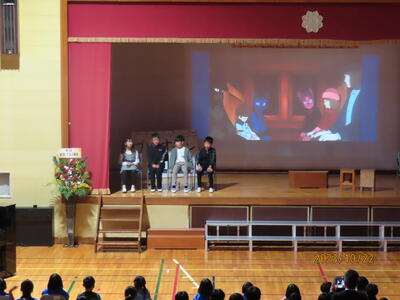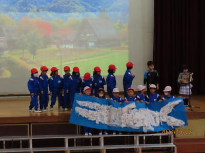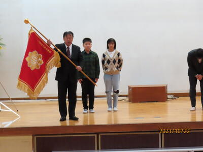 150周年を記念して新しい校旗を作りました。学校の歴史を振り返るスライドショーの後にお披露目しました。