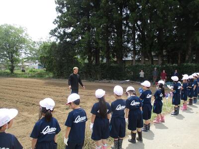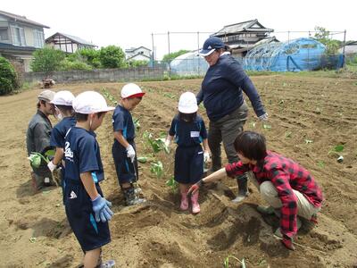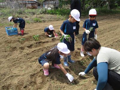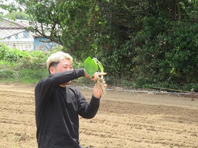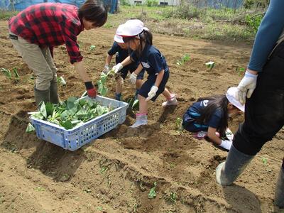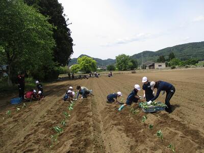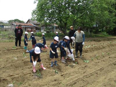 暑いくらいの天気でしたが、1年生は大野村農園さんにいって、毎年行っている「相馬土垂」の植え付けをしました。