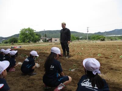 植え方を教えていただき、みんなで植えました。畑いっぱいに植えた里芋が育つのが楽しみですね。時々、成長の様子を観察させていただく予定です。大野村農園さん、ありがとうございました。