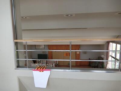 手すりを下から見上げるとバスケットボールを持った男の子が見えました。