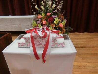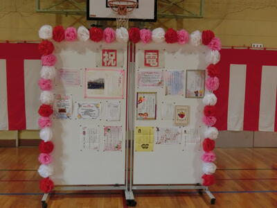 ステージ上も子どもたちの席も、保護者席も、祝電の掲示板も準備できました。