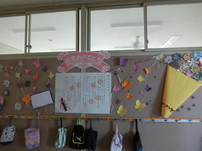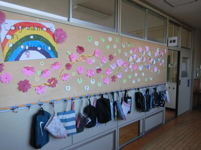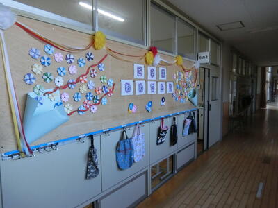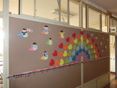 実は、各学級の廊下にある掲示板も、卒業おめでとう掲示になっています。式に参加するのは5年生だけですが、全校生が卒業生への感謝とお祝いの気持ちを込めています。
