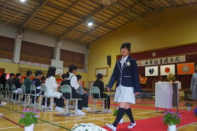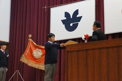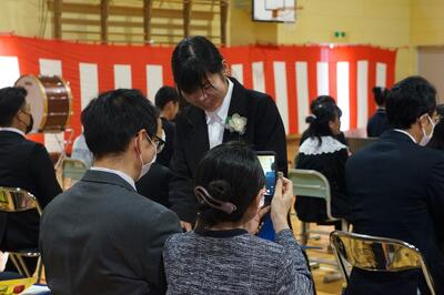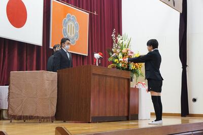 卒業祝い品を受け取りました。代表は山家七夢さんです。