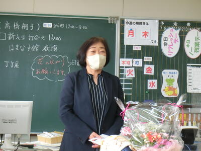 佐藤美紀子先生は本校に4年間勤務していただきました。学級担任の他、研修主任等、重要な役割を多くになっていただきました。定年を前にもう1校経験したいということで、桜丘小学校へ栄転となりました。