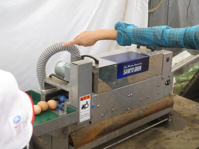 次は唐箕(とうみ)で籾とそのほかのゴミを分けます。風を送って、軽いゴミを吹き飛ばしています。