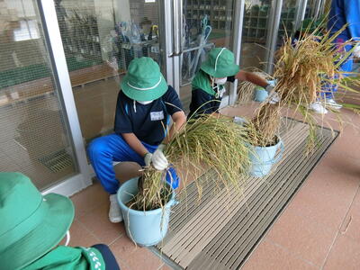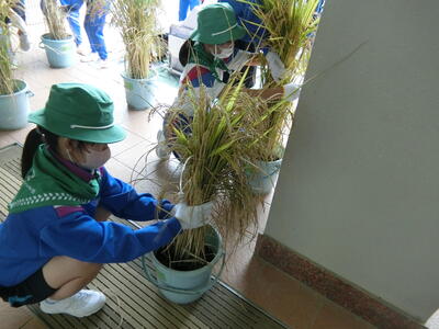 収穫できました。思ったより少ない?お米を作って収穫するのは大変ですね。ごはんのありがたさがよくわかりました。これから、ごはん一粒でも無駄にしたくないですね。