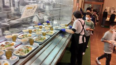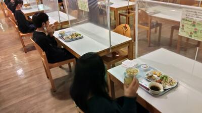 一人分ずつトレイに用意されている食事を自分で運びます。