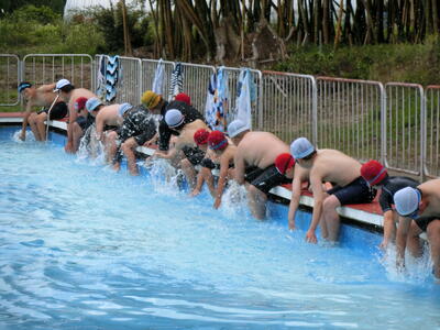 プールに入る時は、プールサイドに手をついて入りましょう。