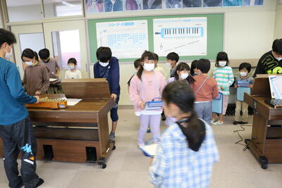 音楽室で6年生が学習していました。いろんな楽器がありました。