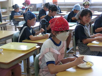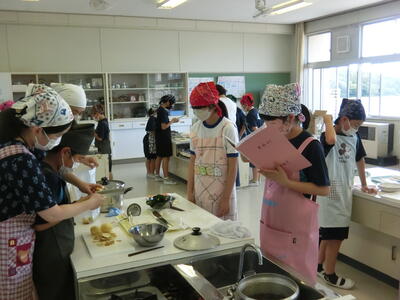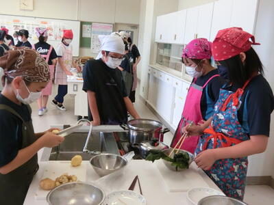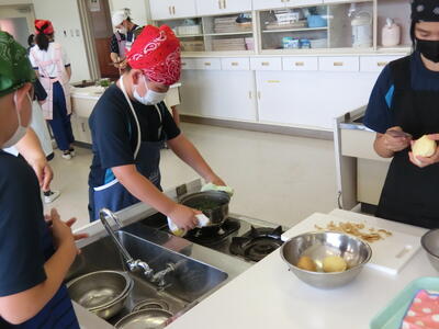 5年生は家庭科で調理実習をしました。今日は野菜を茹でて調理します。